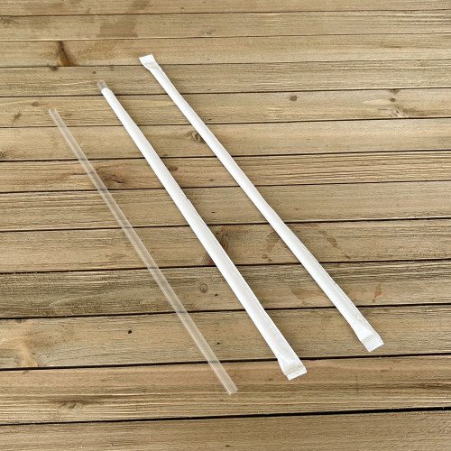 Boardwalk® Wrapped Jumbo Straws (BWKJUMW1025CLR) are 10.25 inches long, made of durable polypropylene, and individually wrapped for maximum hygiene. These clear straws are perfect for smoothies, soft drinks, iced coffee, and other beverages where a larger straw diameter is preferred.