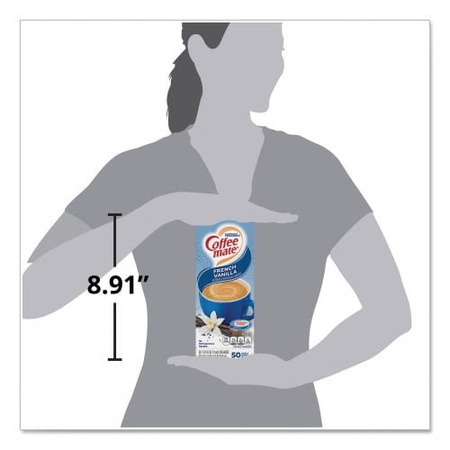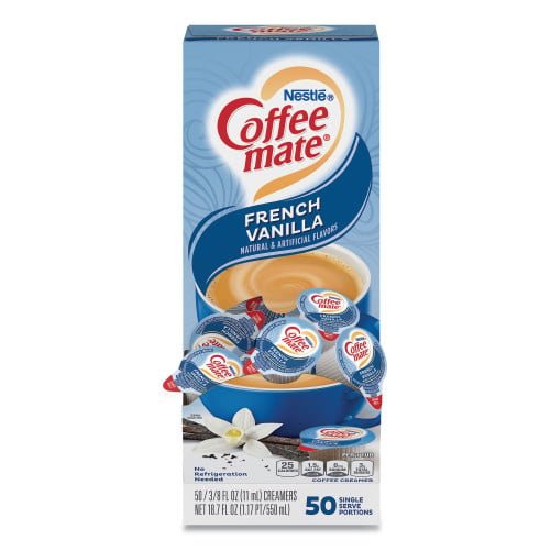 Coffee-mate Liquid Coffee Creamer in French Vanilla flavor (35170BX) comes in 0.38 oz mini cups. Each box contains 50 single-serve cups, providing a convenient and mess-free way to add creamy, sweet flavor to your coffee. Ideal for offices, hotels, cafeterias, and catered events, these mini cups allow guests and employees to enjoy perfectly flavored coffee without the need for a larger container or measuring.