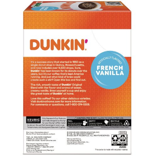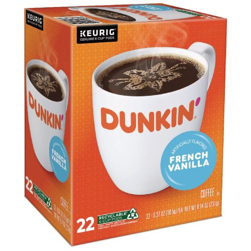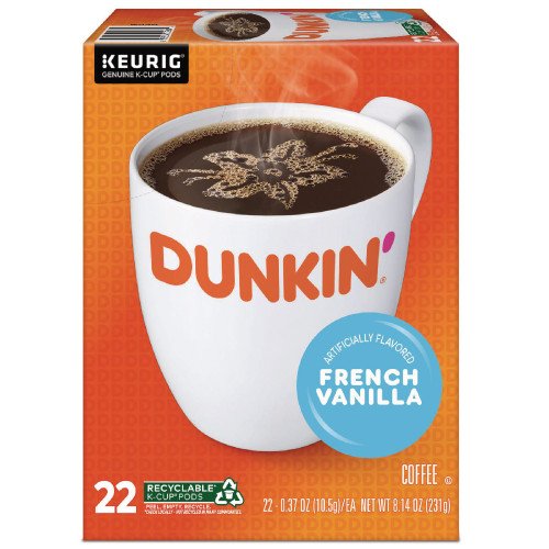 Dunkin’ French Vanilla medium roast coffee in 22 Keurig-compatible K-Cups for home or office brewing.