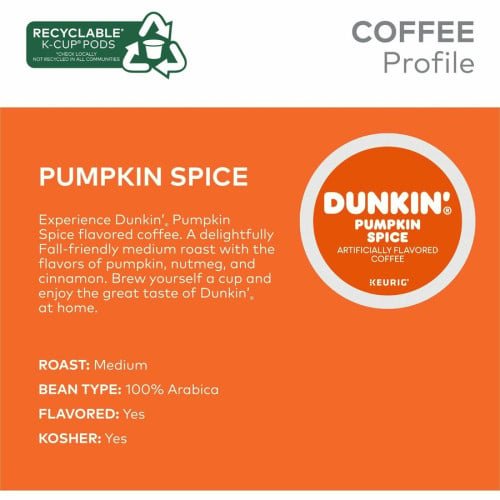 Dunkin’® K-Cup Pumpkin Spice Coffee (7596) delivers the cozy flavors of fall in a smooth medium roast. Infused with cinnamon, nutmeg, and pumpkin spice, this coffee brings the signature taste of autumn to every cup.