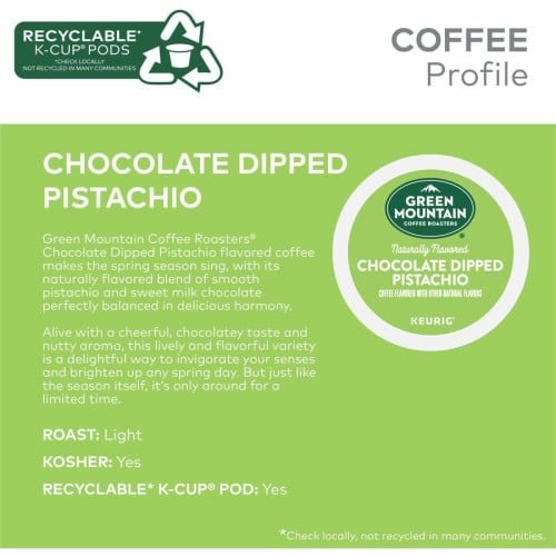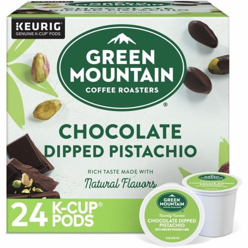 Indulge in a unique and sweet coffee experience with Green Mountain Coffee Roasters K-Cup Chocolate Dipped Pistachio Coffee, 24/Box (0158).