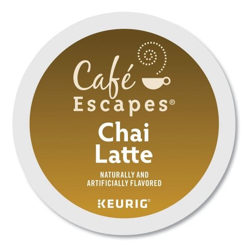 Keurig Cafe Escapes Chai Latte K-Cups, 24/Box (6805) deliver the rich, sweet, and spicy flavor of chai latte in convenient single-serve pods. Compatible with Keurig brewing systems, each K-Cup ensures a fresh, flavorful cup every time without the need for measuring or frothing milk.